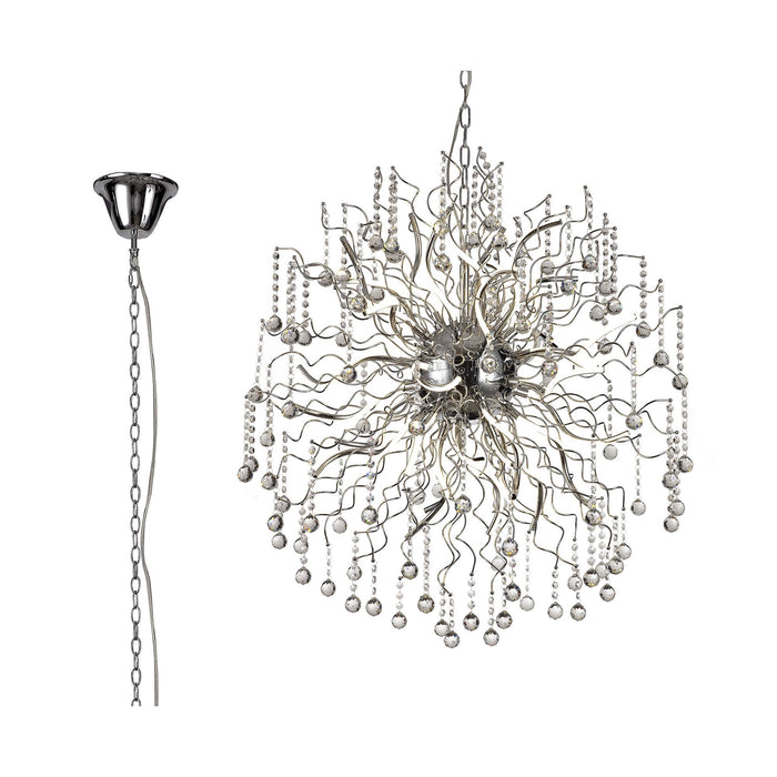 A selection of truly spectacular lighting fixtures, Jaxal fuses an abundance of spiral LED arms with twists of polished chrome metal stems. The chrome corkscrews extend in different sizes and are dressed with strands of dazzling clear crystals buttons finished with clear crystal spheres. Its chaotic amalgamation of varied aspects introduces a mesmerizingly enchanting dimmable range.