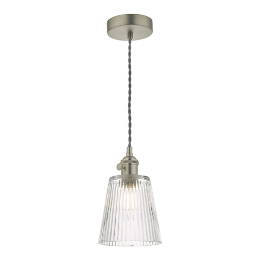 Dar WisebuysIn stockHAD0161-05 Hadano 1 Light Pendant Antique Chrome With Ribbed Glass Shade Height: 124.5 cm Min Height: 26 cm Max Height: 124.5 cm Diameter: 12.5 cm ...