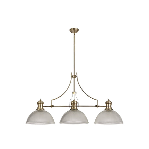 Nelson LightingLow stockLouis 3 Light Telescopic Pendant With 38cm Dome Glass Shade Antique Brass/ClearLength: 1282mmWidth: 380mmMinimum Drop: 740mmMaximum Drop: 1890mmIte...