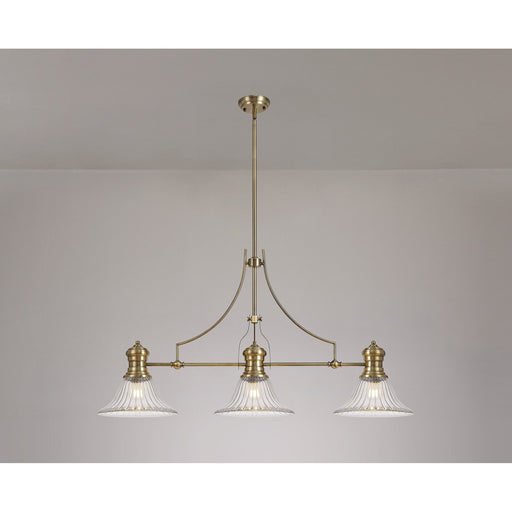 Nelson Lighting NLK04809 Louis Linear Pendant With 30cm Flat Round Patterned Shade Antique Brass/Clear Glass