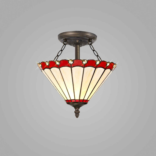 Nelson Lighting NLK02899 Umbrian 2 Light Semi Ceiling With 30cm Tiffany Shade Red/Chrome/Crystal/Aged Antique Brass