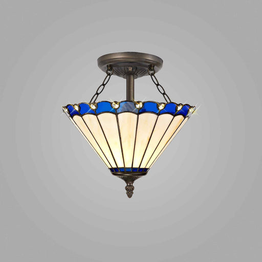 Nelson Lighting NLK03119 Umbrian 2 Light Semi Ceiling With 30cm Tiffany Shade Blue/Chrome/Crystal/Aged Antique Brass