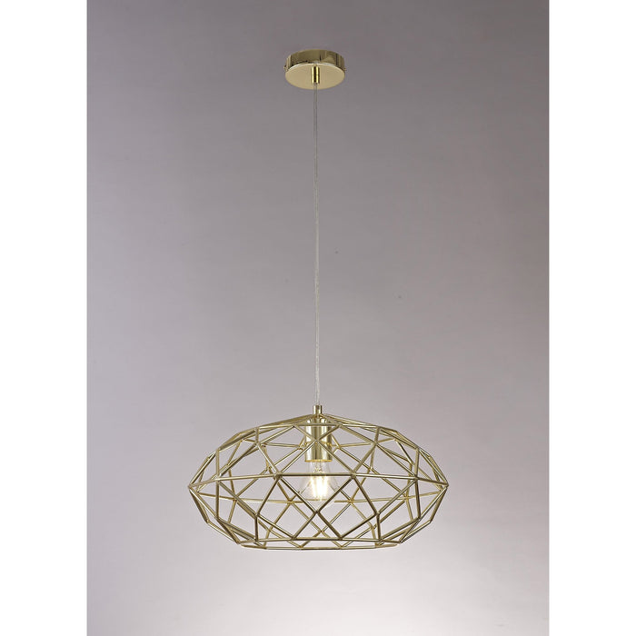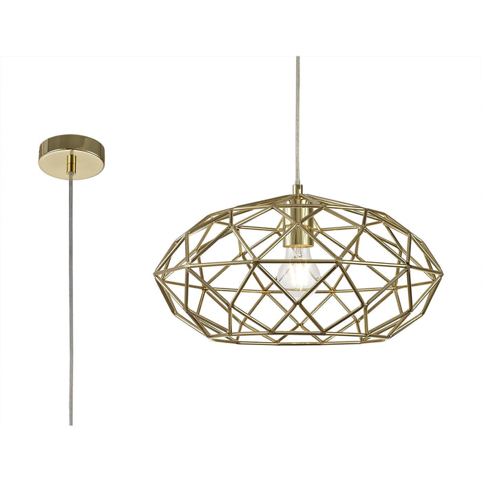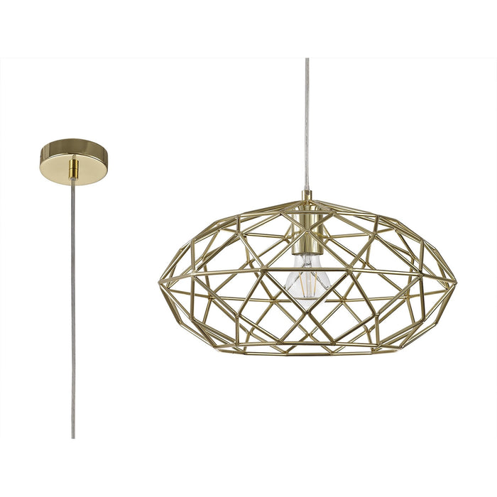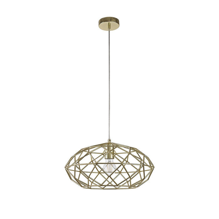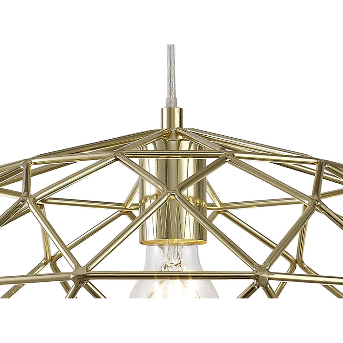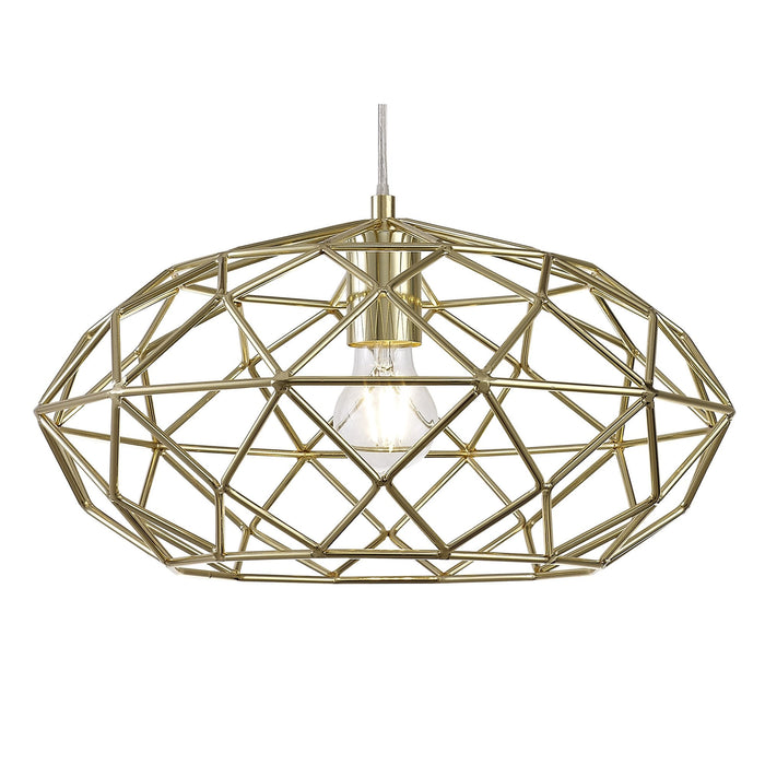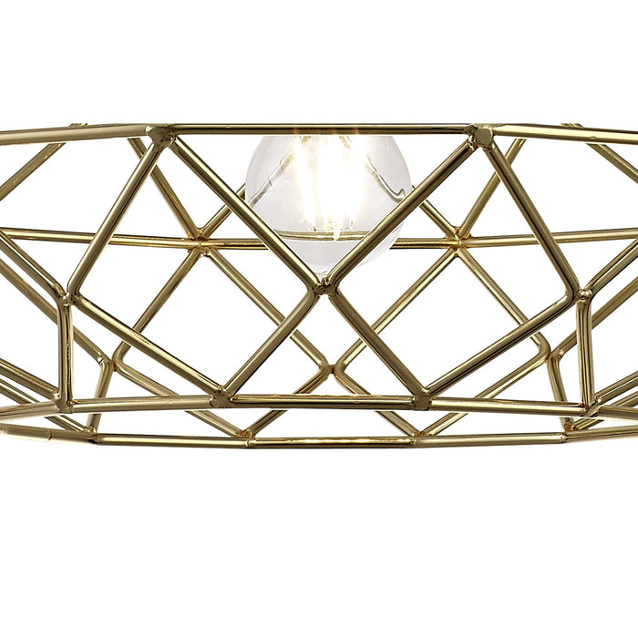 The Eva collection is comprised of a trio of traditional lights, two pendants and one flush ceiling, each with their own unique shape. A body of open triangular and diamond shapes are tiled together to create a prismatic optical illusion around the singular E27 lamp holders. A traditional polished brass finish ensures Eva can be used to enhance the character and eye-catching design of a rustic of contemporary setting with optimum illumination.