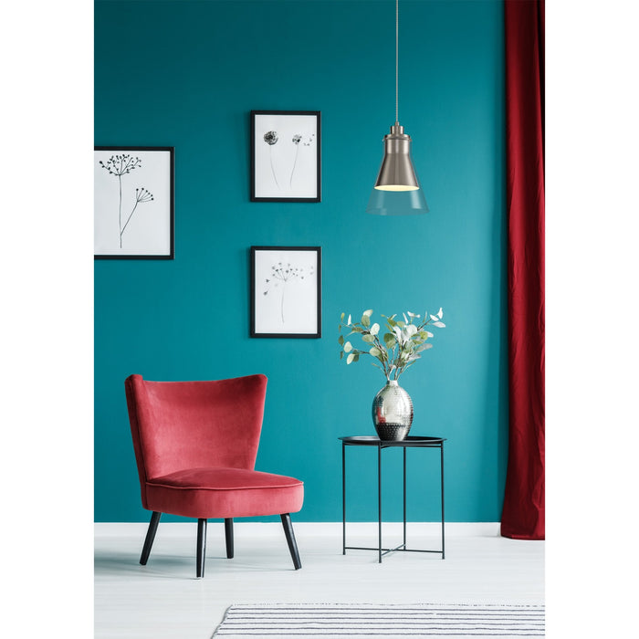 The Hoister single pendants are available in four colour finishes; antique brass, antique copper, polished chrome and satin nickel. The clean metal cone shape holds the E27 lamp holder and provides an open beam of light. The outer clear glass extends a little further than the lamp holder cone so the illumination is has a more ambient dispersal.