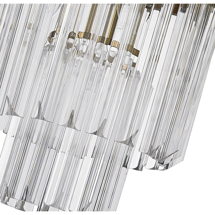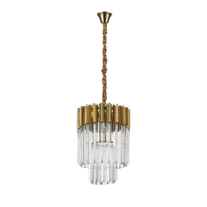 This contemporary design combines a traditional brass finish with clear crystal glass pieces in a long angular shape which are tiered in a round form. Kobra has a traditional Regent effect composed with modern materials to create a range suitable for either a modern or more traditional room setting. The unique, brass, pyramid forms protruding from the frame provide an intriguing overall shape of the pendants, wall lamp and table lamp.