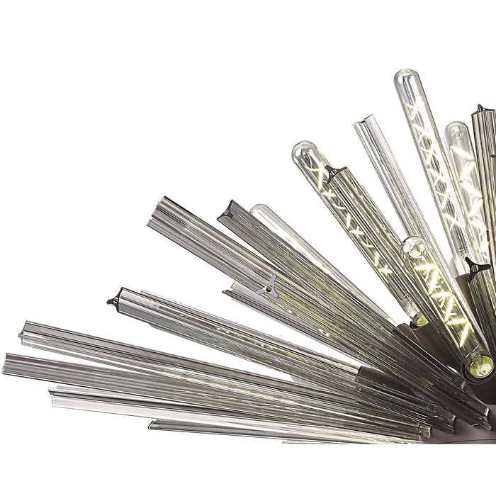The Clover collection presents an intriguing glass shape moulded into a three dimensional triquetra. The grooves along each sized glass create an appealing optical effect which is effortlessly enhanced with the use of tubular lamps. The wide variety of fixtures available in this range span from a 6 light semi flush to an impacting 32 light pendant. The complementing wall lamps available allow for further application built around the same lighting family. Each frame can be chosen with either a brown oxide, polished nickel or matt black frame with either clear, champagne gold or smoke glass.