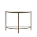 Demi lune shaped console table. Aged bronze finished metal framework. Tempered clear glass top. Mirrored glass under shelf. Anti topple kit.