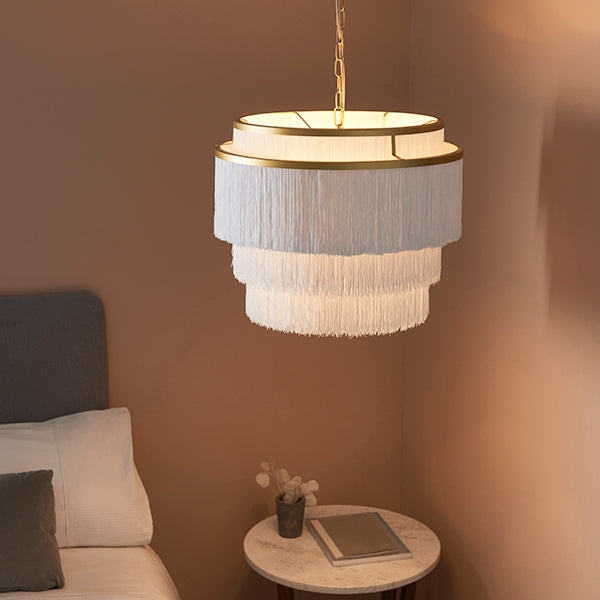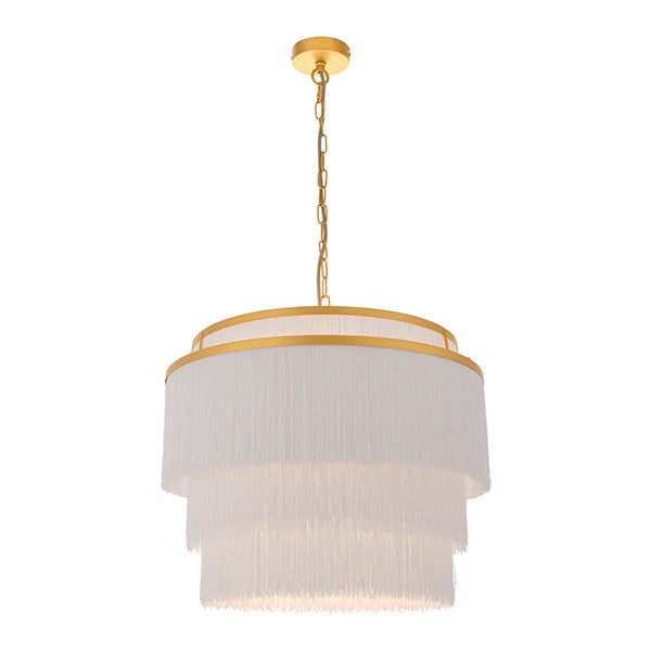 Adorned with thousands of fine white soft tassels. Matt gold painted metal work. Diffused light effect. Height adjustable chain with 1.5 metre grey fabric cable. Perfect for use with E27 LED lamps