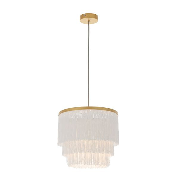 Adorned with thousands of fine white soft tassels. Matt gold painted metal work. Diffused light effect. Height adjustable 1.5 metre grey fabric cable. Perfect for use with E27 LED lamps